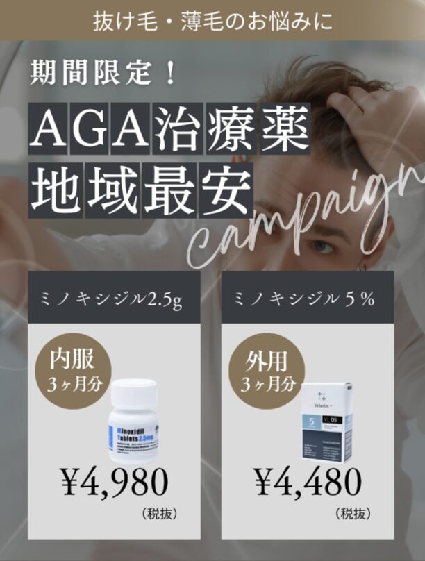 AGA治療薬が地域最安値のキャンペーンを期間限定で開催いたします。